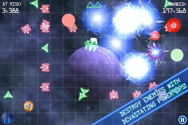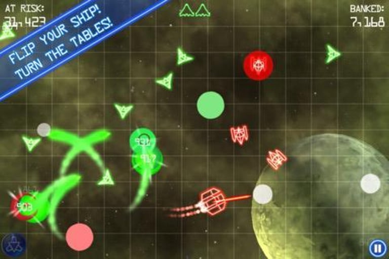 FlipShip is an arcade-style action shooter combining tilt-based movement with a color-switching mechanic. Players guide their ship by tilting the device, while tapping the screen flips the ship’s color between two hues: you can only destroy enemies of the same color, and colliding with enemies of the opposite color means instant death. What makes the game compelling is its risk-reward system: the longer you stay in one color the higher your score multiplier climbs, but you must flip (thus resetting the multiplier and banking your points) before a mistake wipes out your unbanked score. With three ships to choose from, each with distinct speed, fire-arc and a special ability, and challenging difficulty modes, FlipShip offers an intense high-score chase wrapped in neon-vector visuals and fast-paced gameplay.